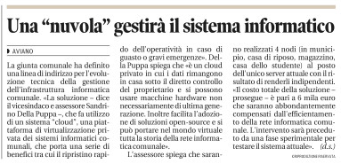 Parte il Progetto Cloudweavers al Comune di Aviano (PN), per l'evoluzione tecnica della gestione dell'infrastruttura ICT comunale. In allegato l'articolo del Messaggero Veneto del 5 Marzo 2014.